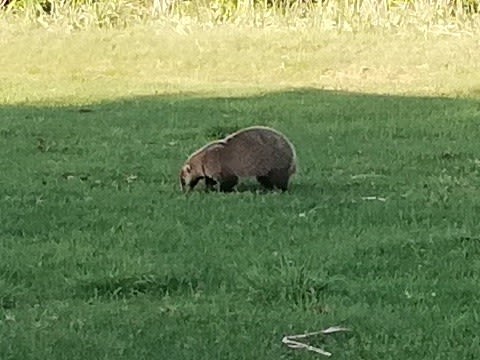 登山口に戻り、温泉町方面にクルマを走らせると、道路わきの草原にアナグマがいた。