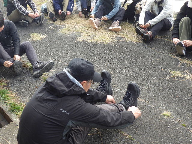 登山口から階段を上がって、クルマが来ない場所で、まずは登山靴のヒモを